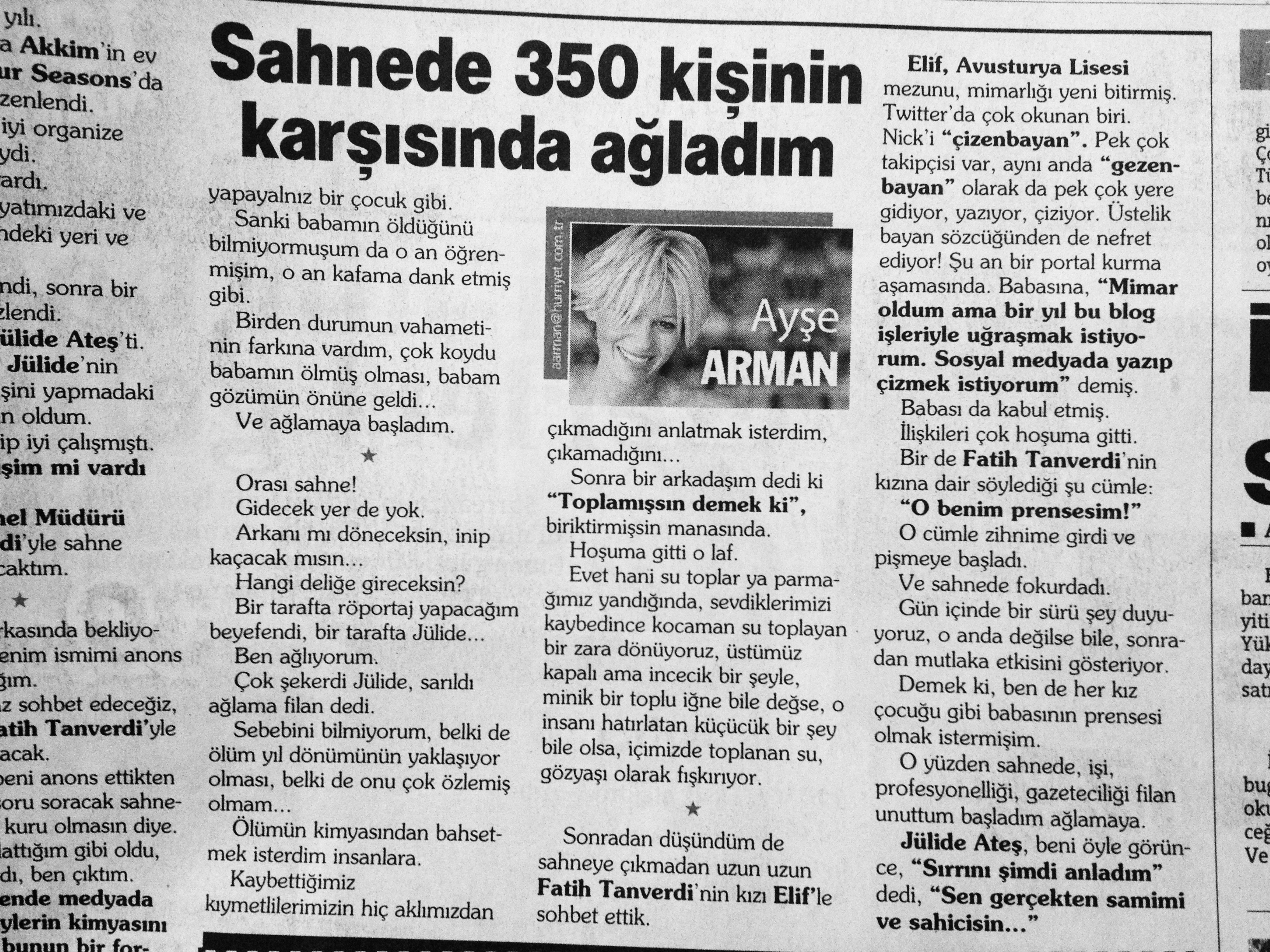 Hürriyet – Sahnede 350 kişinin karşısında ağladım (Ayşe Arman)